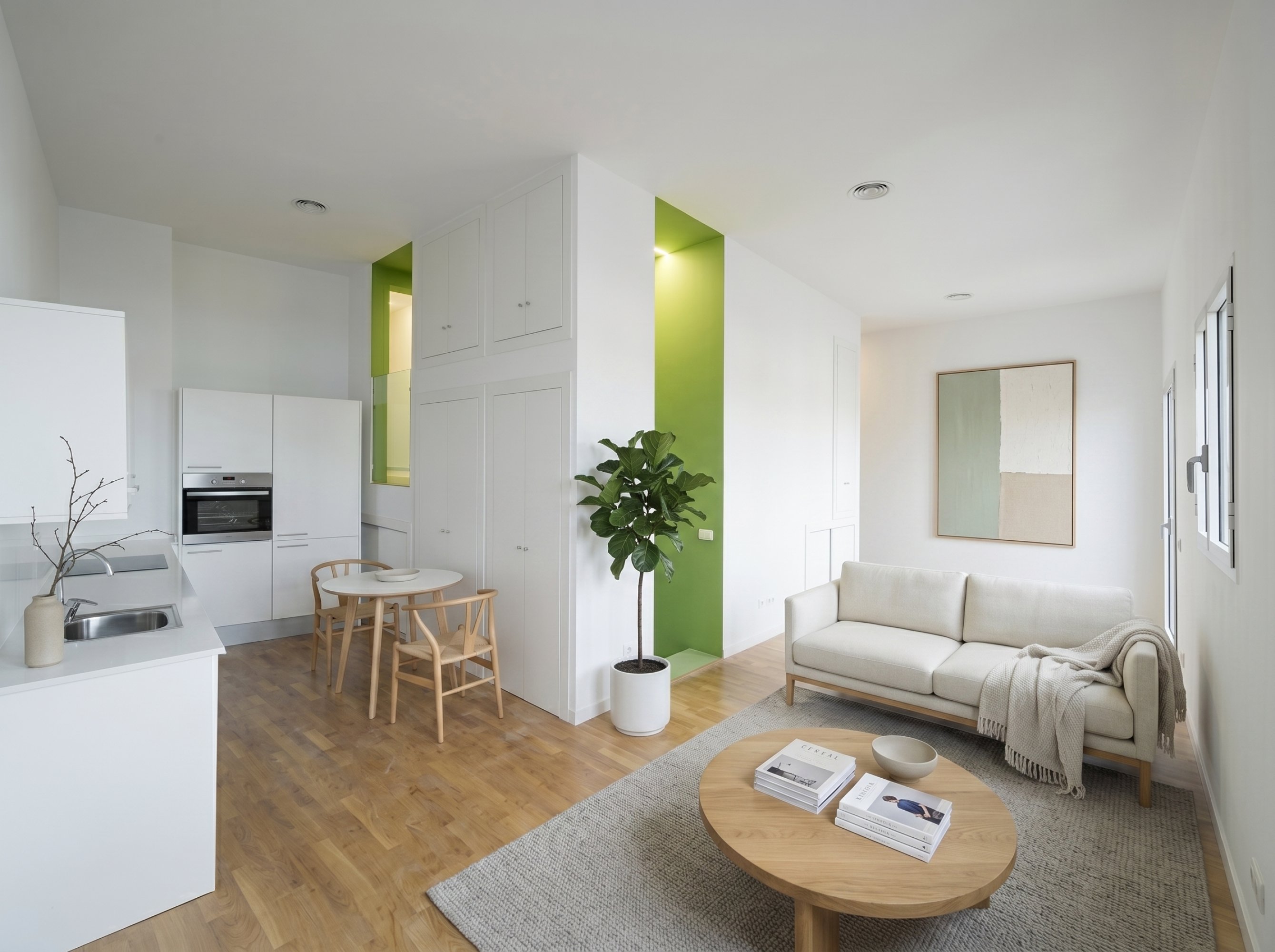Esta decisión contribuye a evitar que este vacío se entienda como una separación entre los vecinos que viven a ambos lados. Estratégicamente, ambos lados de la intervención se trabajarán de un modo simétrico para enfatizar la idea de construir una sola pieza-casa, en este caso vaciada en su interior.