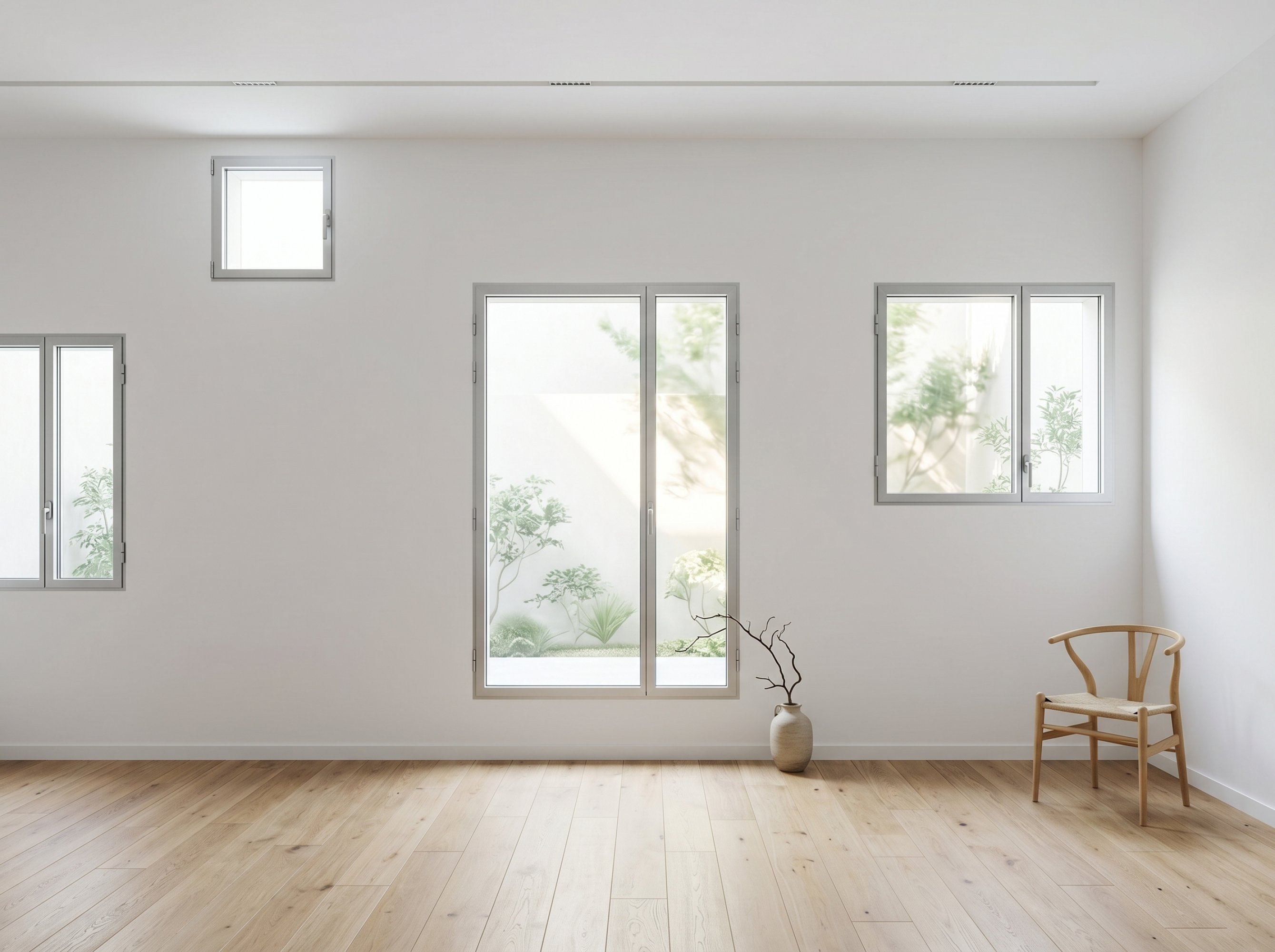 El hueco climático: el único de altura igual a la estancia que abre. Mediante la extensión de su persiana se permite ventilar el interior mientras se protege de la radiación solar, creando un ambiente fresco y de penumbra en su interior.